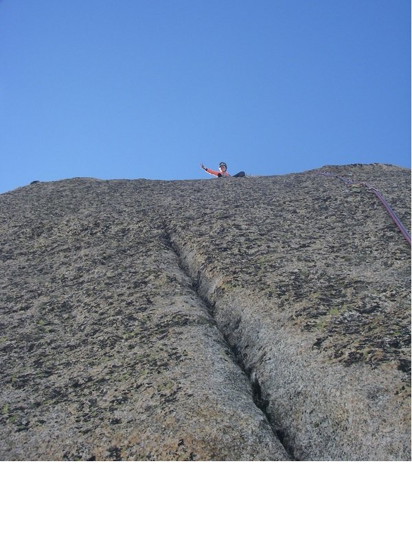 Nos dejan en el último largo, un 6c+/A0, una placa de granito oscura que culmina en la cumbre.