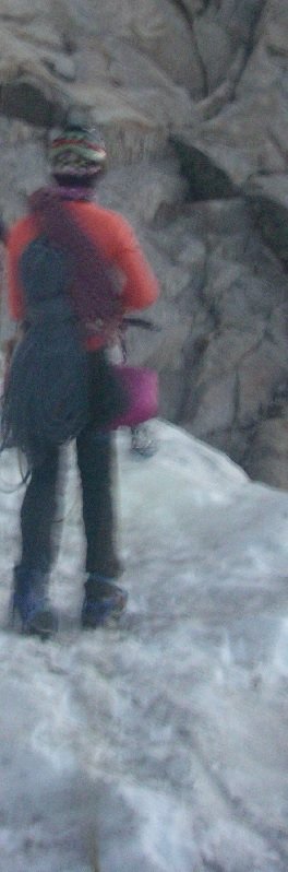 Estoy emocionada y asustada. No sólo por la escalada, una vía de 24 largos entre V y 6c+. Sino también por la aproximación, atravesando rimayas, grietas y placas de granito mojadas. Al final, con la luz de los frontales, el camino no parece tan expuesto. Y el suelo de nieve mezclado con mica brilla como purpurina negra bajo mis pies.