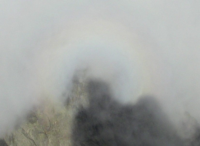 No me creo estar allí. Son las 16.00 de la tarde y el sol ilumina todo. Desde las alturas contemplo nuestra propia sombra que se refleja en las nubes, rodeada de un aura de arcoíris. Ruth lo llamó “Brocken Spectre”. Una de las visiones más bellas de mi vida.