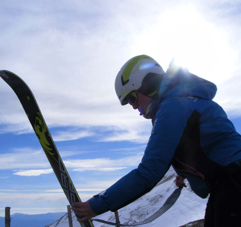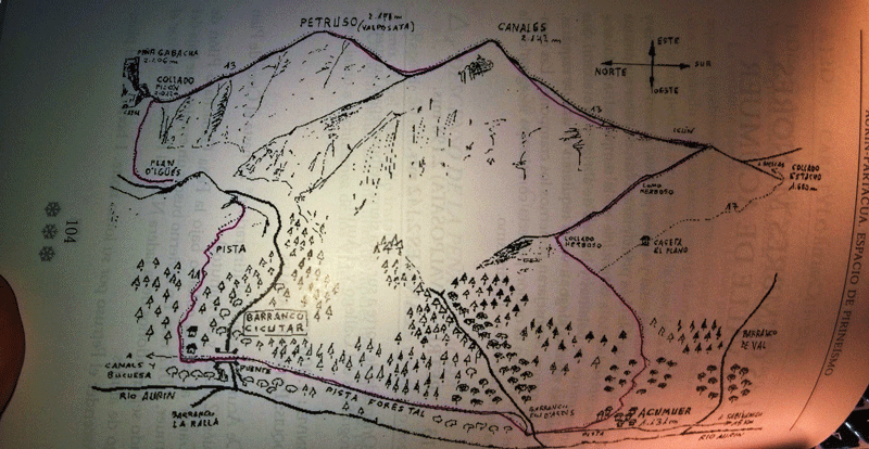 De vuelta a lo esencial y en consonancia con ello Jesús me regaló varias guías suyas de estas zonas secretas del Pirineo. Con un prólogo de Jean y Pierre Ravier que también disfrutaron en el pasado del refugio de Acumuer; salpicadas de fotos en blanco y negro, croquis y mapas dibujados a mano alzada sin coordenadas UTM. Jesús enseñándonos sonriente uno de esos croquis nos propuso una actividad de esquí de monte muy larga.