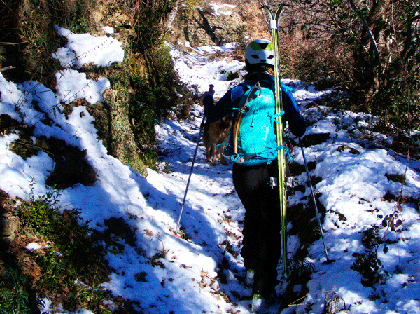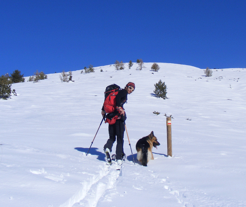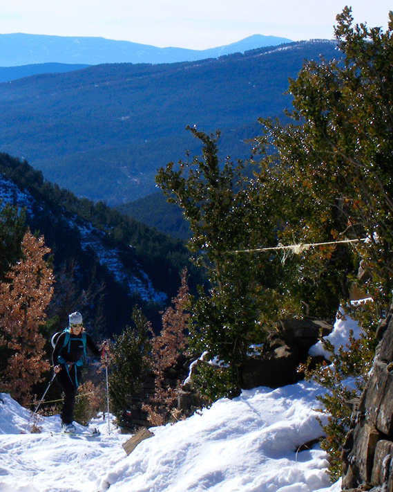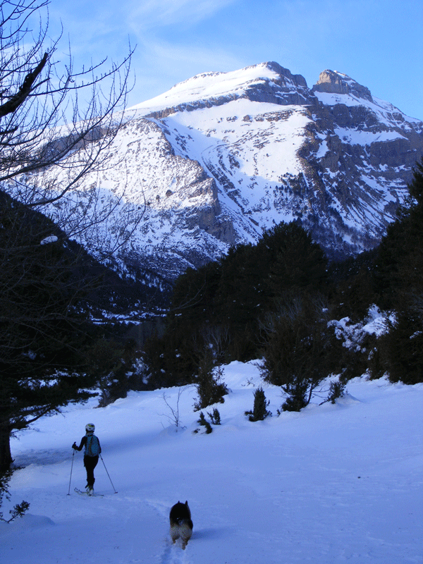 Consistía en subir el Pico Canales, no muy alto 2142 m, bajar por un Collado y recorrer de vuelta una larga pista. Casi 1000 m de desnivel y más de 15 Km de ruta, largos tramos de portear los esquís a la chepa, zonas de nieve y hielo de todo tipo, una bajada de buena nieve (pouuuu) y una pista infinita entre bosques.