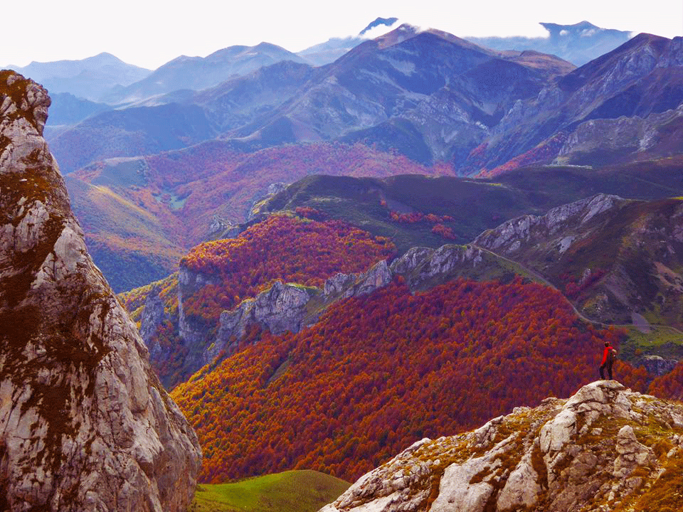 Este cielo nublado, enmarca los bosques, que resaltan aún con más ardor. Y a lo lejos, las millones de hojas rojas que vibran mecidas por el viento, simulan las heridas abiertas de las montañas.