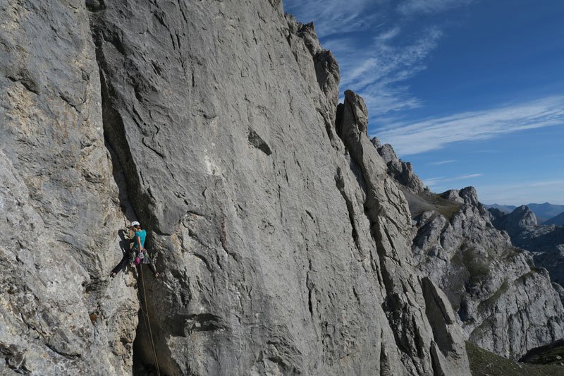El siguiente largo mucho más sencillo me permite bajar pulsaciones, disfrutar de una escalada relajada y sonreírle a Manu Pratts. Que colgado del vacío nos echa fotos, se le ve feliz, le apasiona lo que hace. Y de repente dice: “La tenemos” y se le ilumina la cara.