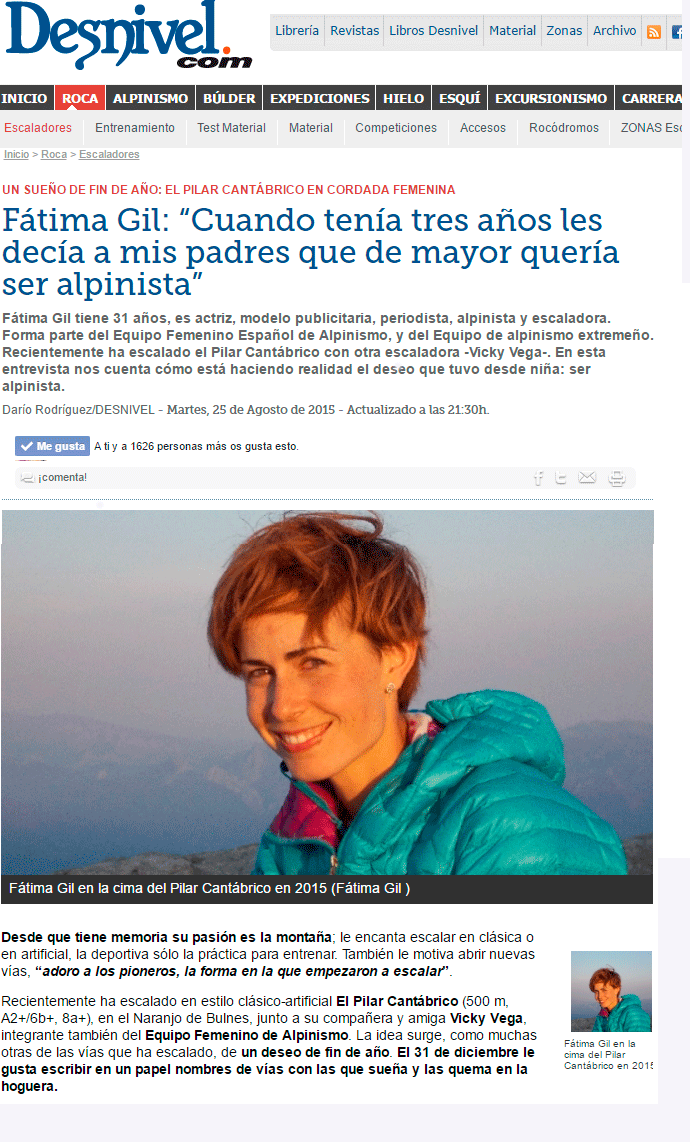 Cuando tenía tres años les decía a mis padres que de mayor quería ser alpinista y actriz. No sé dónde vi a alguien escalando, supongo que en algún programa de televisión. En mi familia no hay tradición de montaña, incluso mi madre tiene vértigo. Pero yo siempre que iba a mi pueblo en la sierra norte de Madrid y pasaba por el Pico de la Miel (La Cabrera) le decía a mis padres que de mayor lo escalaría. La primera vez que llegue a su cumbre fue muy emocionante. Me impresionó más que otras cimas posteriores. Para mí era la culminación de un sueño de la infancia».