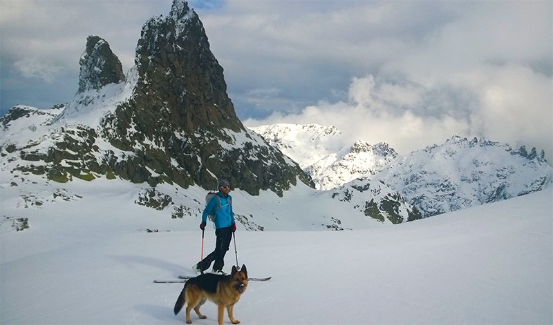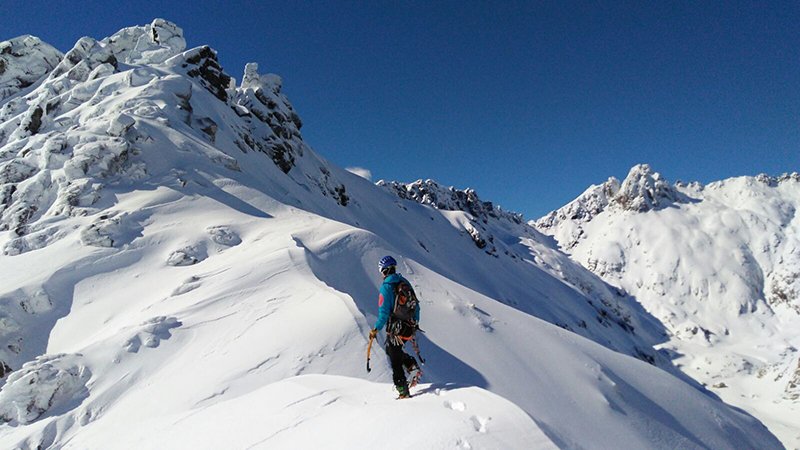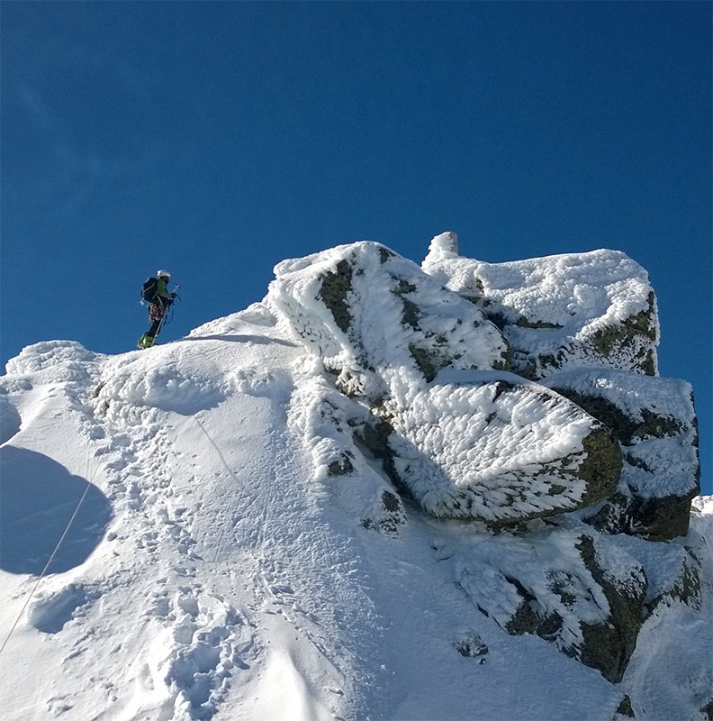 La pequeña saltimbanqui se contorsionaba para no perder el equilibrio. Se centraba en la sutileza de una danza precaria sobre un suelo vertical y efímero que en cualquier momento podría desasirse y hacerla volar hasta sobrepasar a su compañero. Para no convertirme en la mujer bala que aún no tocaba ese número, me concentre con todas mis fuerzas. Resople, !vaya¡ si resople, pero supere las dificultades y fui recibida por una cima de nieve polvo que me costó conquistar. Allí dejamos nuestras breves huellas sobre su blanco impoluto.