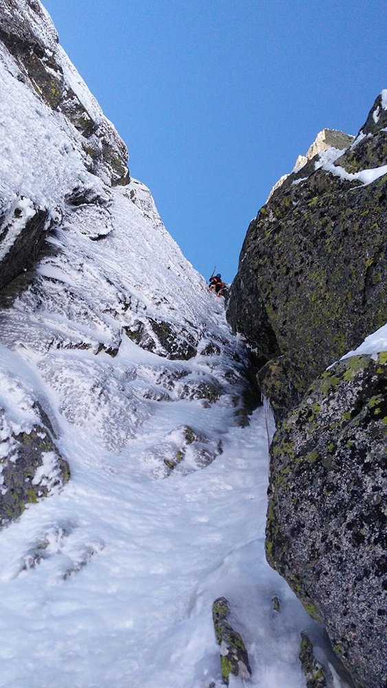 Que parecía poca cosa y resulto ser otra muy diferente. La exposición aumentaba según ascendía entre la roca y la nieve pegada a ella. Todo tapizado de blanco, imposible de proteger. Fue un número arriesgado, de esos que hacen los acróbatas sin red. Y donde no cabe el error, no te puedes caer. Pero cuando andas por la cuerda floja nunca se sabe. 60m, tres seguros: el primero bueno; el segundo, una cinta que adornaba cual guirnalda un bloque helado y que se deslizo cuerda abajo ante mis ojos al sobrepasarlo; y el tercero casi en la cumbre. Abajo en la reunión una mente matemática calculaba los metros de caída. Arriba una mente menos matemática intentaba no calcularlos.