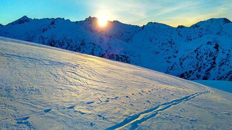 Durante el intermedio, momento donde el público aprovecha para ir a comprar chucherías, nosotros hicimos una escapada-escapista de esquí. Subimos al Venteadero rodeando la base del Impresionante Ameal de Pablo. Y disfrutamos de una bajada gustosa y entretenida de buena nieve. Al llegar al refugio para continuar con la función, pedí fuertemente al cielo que nevara un poco más para el día siguiente, para el tercer acto.