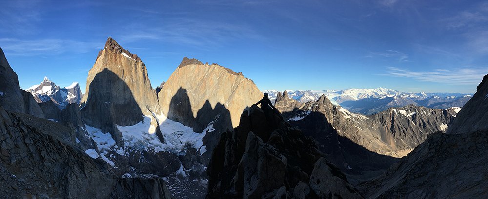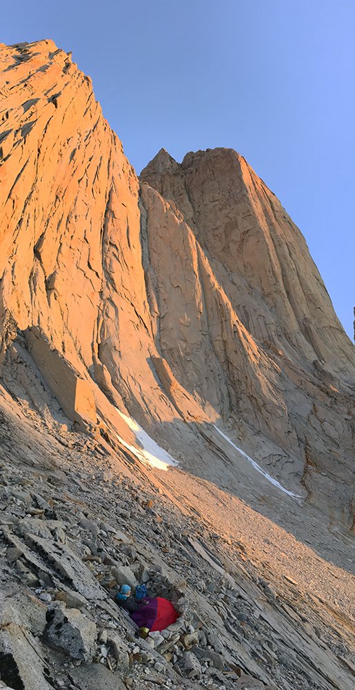 Pasamos de largo varios vivacs y, sin saberlo, nos saltamos la cajita Williams. Ya no queda ni rastro de lo que un día fue el hogar de los británicos. Con esa inercia de ir más cerca, llegamos a la base de la Torre Norte y por suerte encontramos una pequeña terraza donde pasar la noche. El cielo se ha abierto y las vistas son indescriptibles. Estamos rodeados por moles imponentes de granito, a un lado las Torres se nos presentan inaccesibles. Y al frente el Escudo y la Fortaleza se ven igual de inexpugnables.