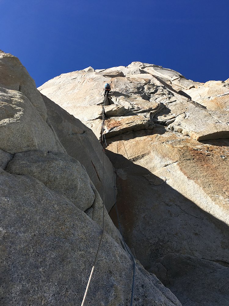 Aún es noche cerrada cuando vemos los primeros frontales, made in USA. Demasiado temprano, demasiado frío y sin luz es muy fácil perderse, mejor esperar a que aclare. Cuando ocurre aparecen más frontales, esta vez conocidos. Son Felipe y sus amigos que también van a la central. Los galgos chilenos que van a la Monzino. Y la cordada de Camila y Romano que van a Taller del Sol. Gracias a ellos podemos llenar mi termo de agua caliente, lo reservaremos como oro, para la noche en pared.