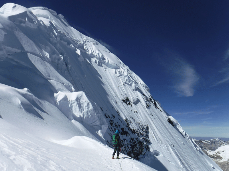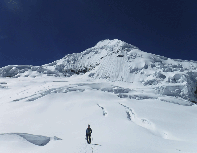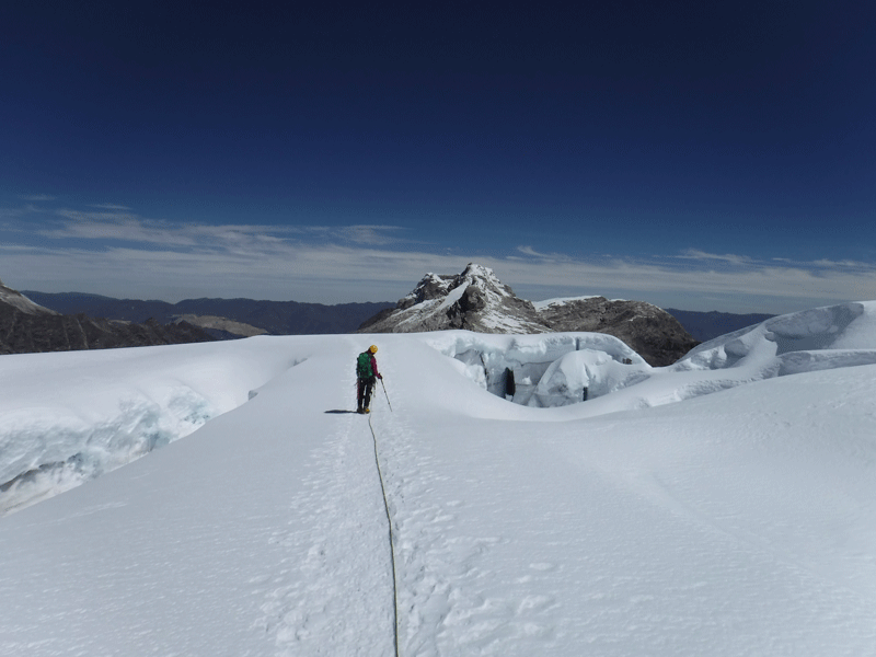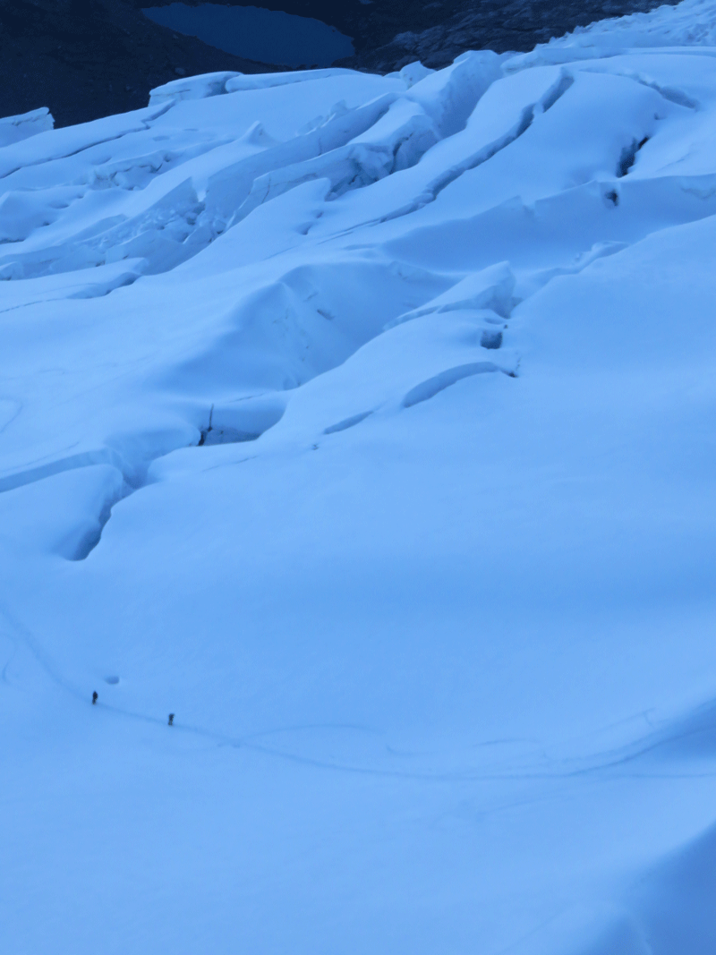 Tocllaraju significa  «Nevado con trampas» y aunque vamos siguiendo la huella de los primeros que salieron del campo de altura, tenemos que ir sorteando profundas grietas, que con tan poca luz, tienen un aire siniestro. Son como pozos sin fondo repletos de purpurina. Vamos unidas por una cuerda en este desfile pesado. Y así, sin prisa, pero sobre todo sin pausa, ascendemos el inmenso glaciar.