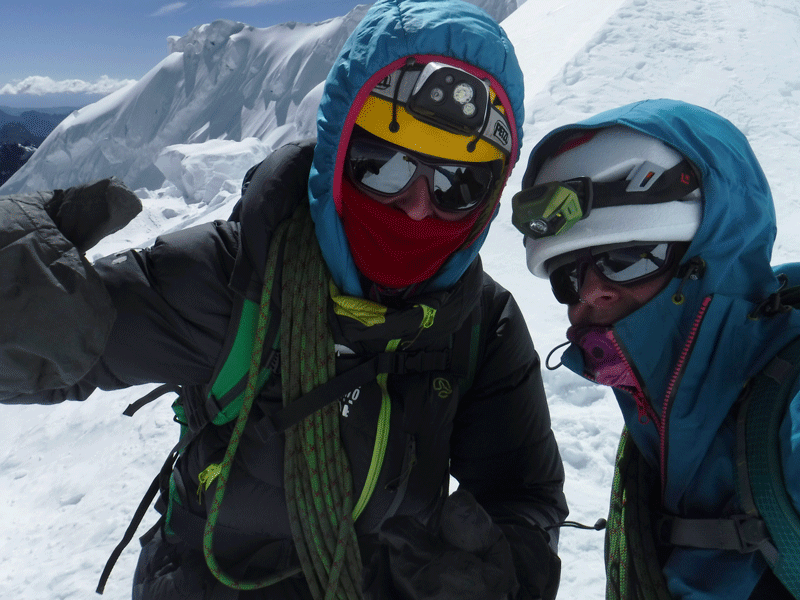 Tras escalar entre los seracs llegamos a la arista Noroeste y me encuentro con el ansiado sol. Lo que tanto había esperado por fin sucede. Grito a Vicky: “SOOOOOllll”. Pero al instante me doy cuenta que tampoco cambia nada. Al contrario, el viento en la arista empeora la situación, es tan fuerte que el sol no puede competir contra él. Lo que sucede es que la combinación de viento y sol nos corta la piel de la cara. Yo dejo de sentir los dedos de la mano izquierda, los muevo pero parecen de madera. El viento nos ataca desde el flanco izquierdo y todo lo que se interpone a su paso es asolado por un frío extremo.