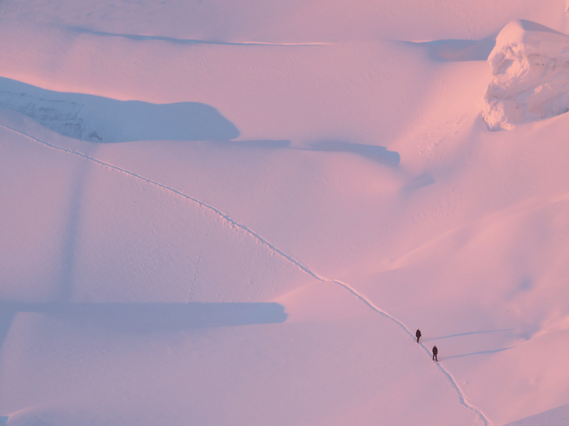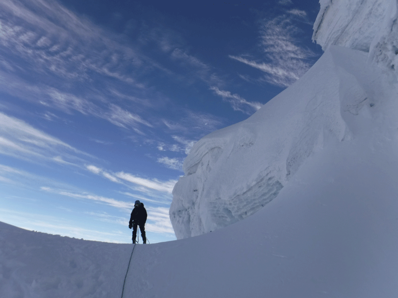 De repente siento que el frío empieza a pesarme y engaño a mi mente imaginando que cuando se haga de día pasaremos calor. La luz del sol nos calentará el cuerpo y el alma. Y de esa forma, seguimos ascendiendo adentrándonos en un glaciar tenebroso. Pero el frío a cada paso se hace más insoportable. Y nos quedan aún muchas horas de oscuridad helada.
