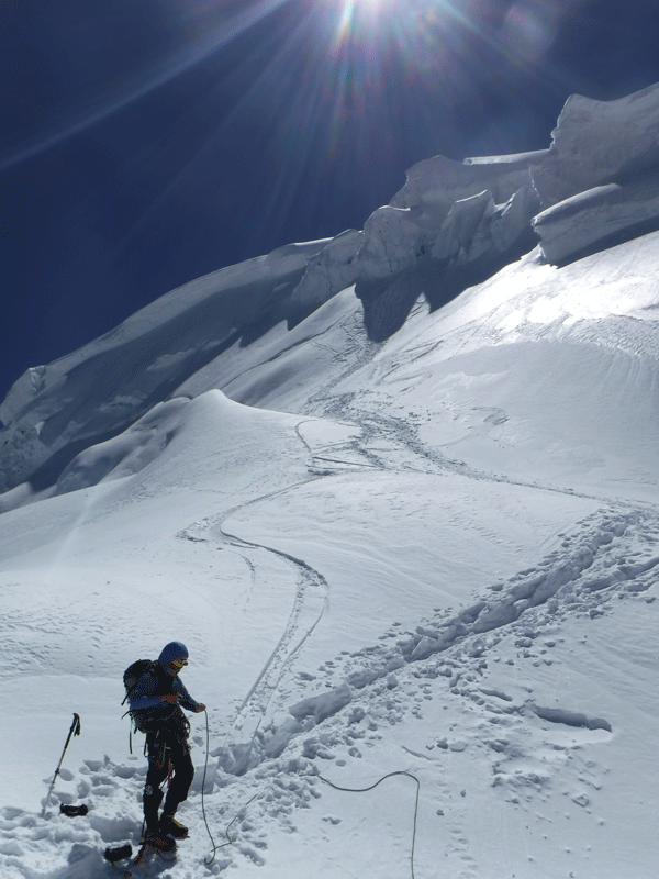 En la ascensión por el glaciar vemos como algunas cordadas que salieron desde el campo de altura se dan la vuelta. Entre ellos nos sorprende ver a lo americanos que nos dieron el parte el día anterior. Nos dicen que con el viento la sensación térmica es muy baja. Creo entender «minus fourteen degrees», poco me parece… Pero este hecho no nos amedranta, nosotras seguimos adelante. Con la esperanza en que el sol en unas horas acariciará nuestra piel.