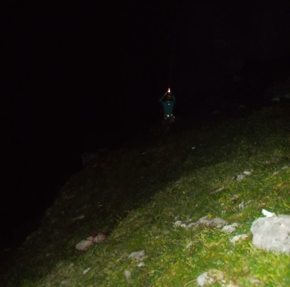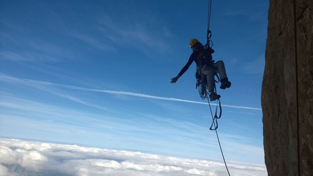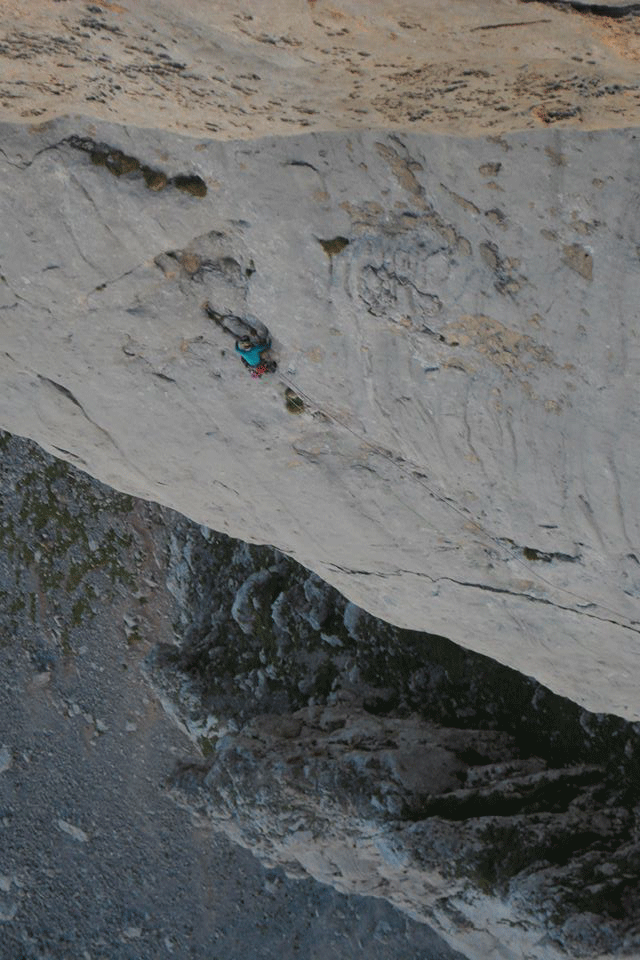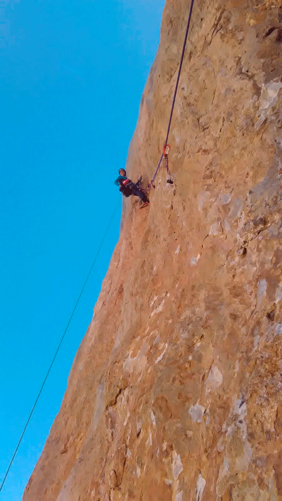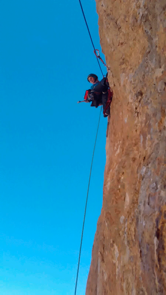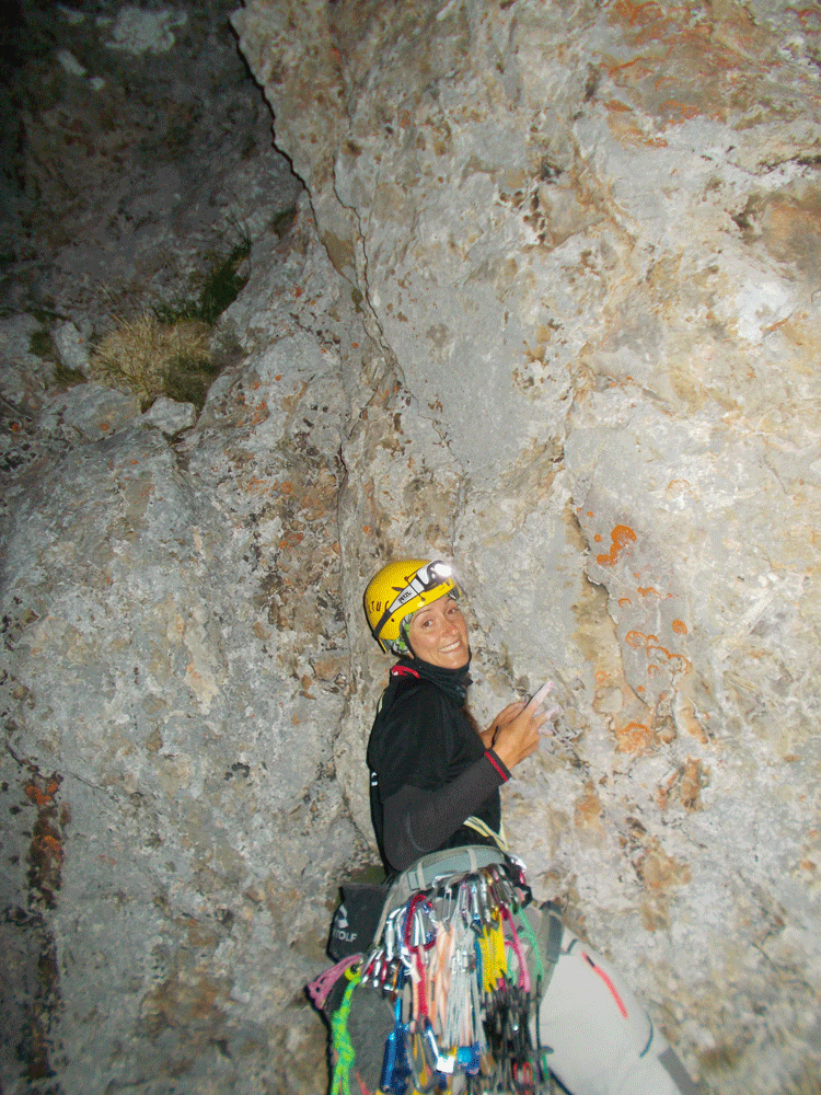 3º día: Otra vez salimos a la penumbra, pero hoy los astros brillan con una intensidad especial en el cielo. Dirigimos nuestros pasos hacia el desplome. Un hilo negro pende directo de las estrellas. Hay que engancharse a él y subir. Ganarle metros al vacío. Volvemos a brillar en la inmensidad de la noche, pero esta vez nadie nos ve y nuestros frontales van ascendiendo. Cuando estas colgado de la oscuridad a 50 metros del suelo, en tierra de nadie, se te pasa de todo por la cabeza. Es tan bello como dramático.