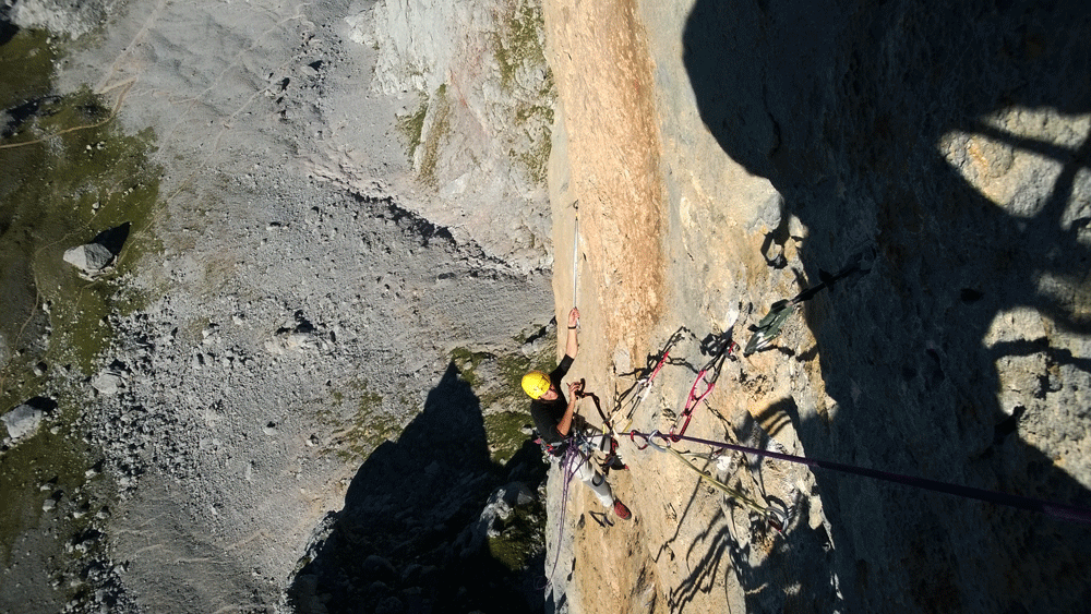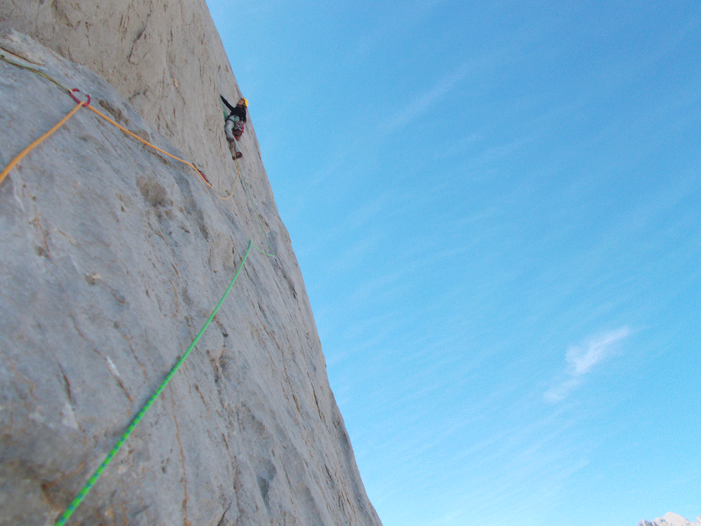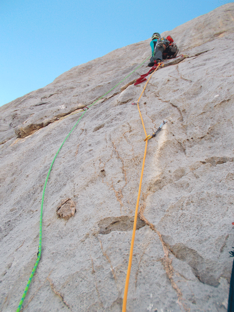 Vicky, que ganó ayer, empieza a escalar una chimenea infernal, sufre, se arrastra y asciende lentamente. No se ve nada, solo sé que caen rocas y que no puede proteger bien. El segundo largo de fisura también me planta cara, una fisura ancha, que sin friends grandes me hace arriesgar una mala caída nocturna. El último tramo de este V+ discurre por una placa imposible de proteger, es muy expuesto. Cuando alcanzo la R2, veo que si queremos escalar esta vía tendremos que dejarnos la piel. Aquí no hay largos fáciles. Vicky sigue con una travesía descendente de 6b, que la oculta tras un gendarme. Yo la oigo resoplar y entiendo que otra vez la vía enseña los dientes.