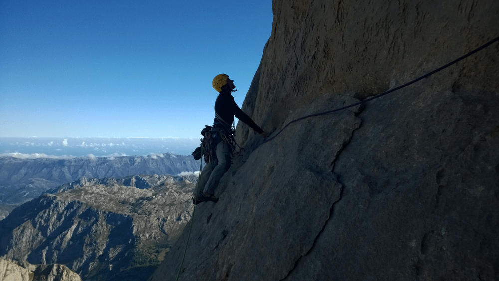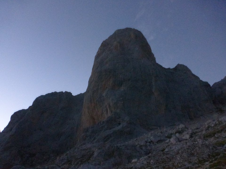 Para aclimatar escalamos una clásica en la Peña Vieja. “El espolón de los franceses” una larguísima actividad que termino con una impresionante tormenta eléctrica. El cielo rugía con furia y se iluminaba violentamente sobre nuestras cabezas. Y temíamos a los hierros a los que horas antes confiábamos nuestras vidas. Cuando el trueno nos ensordecía tirábamos la mochila al suelo y nos hacíamos una pelota, rezando con todas nuestras fuerzas para que el rayo no nos alcanzase. Cuando el cielo se encendía recogíamos las mochilas y salíamos corriendo hasta el siguiente tambor.