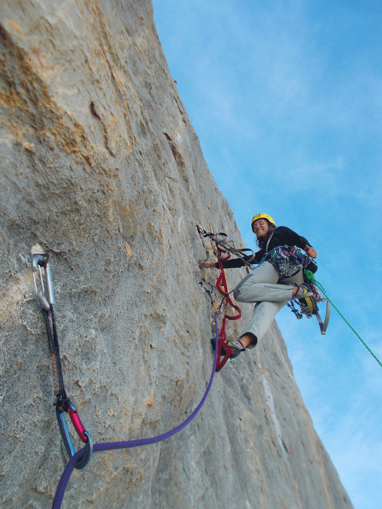 Con las primeras luces del alba llegamos al último punto alcanzado por Vicky ayer. Un largo de A1+/6a? me espera. Los estribos se quedan más abajo y me separo de los seguros. Bailo, navego y vibro como nunca. Me siento cansada. ¿Cuándo terminarán las dificultades?. Vicky me anima con fuerza y a pesar de la precaria protección en travesía sigo ascendiendo, ahora muy a la derecha, luego muy a la izquierda. Navego por donde la roca me deja ir. Una placa fina donde dibujar un camino incierto y relativo. Cuando llego a la reunión después de 50m me siento realmente vacía. Sólo puedo pensar en el siguiente largo de 6a+, que tras quince metros de IV me vuelve a tocar a mí. Cuando llego a esa reunión, no tengo fuerzas, y le pido a mi compi que siga por mí. Que necesito tomar aire.
